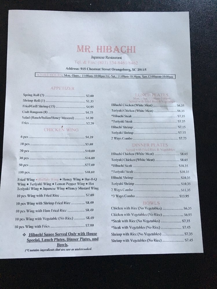 Welcome to Mr. Hibachi Steak House, a culinary gem nestled in Orangeburg, SC. This vibrant Japanese eatery offers an extensive menu that celebrates traditional hibachi flavors with a modern twist. From juicy Hibachi Chicken and expertly grilled Teriyaki Steak to tantalizing Teriyaki Shrimp, each dish is served with fragrant fried rice and fresh vegetables, ensuring a satisfying dining experience.